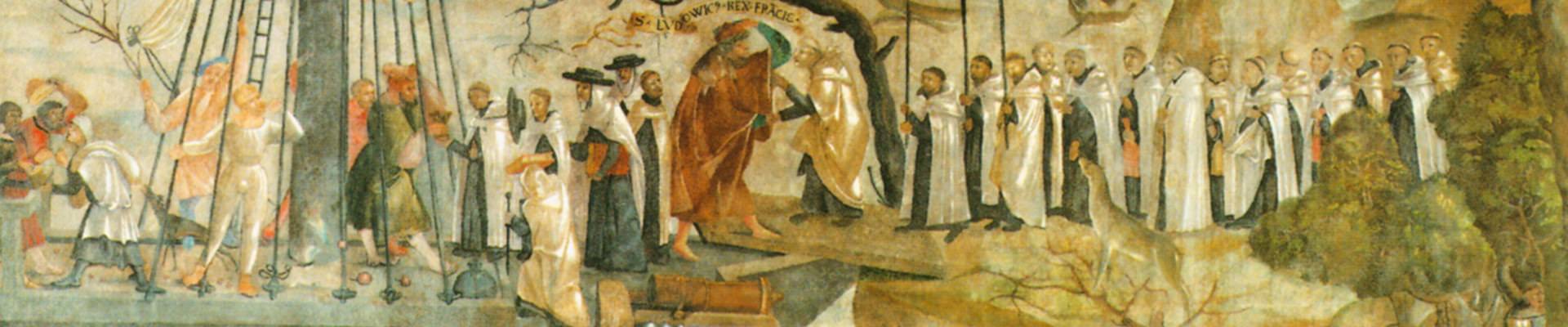 1515, als dem Frankfurter Karmeliterkloster reichlich Stiftungsgelder zuflossen, erging der Auftrag zur Ausmalung des neuen erweiterten Kreuzganges an Jörg Ratgeb (1470/75-1526). Der aus Schwäbisch Gmünd stammende Künstler war ein Zeitgenosse von Albrecht Dürer, Mathias Gothard, gen. Grünewald, Martin Schongauer und Tilman Riemenschneider. Seine Malerei weist Einflüsse des Hausbuchmeisters, Grünewalds sowie der Malerei Flanderns und Venedigs auf. Das prestigeträchtige Projekt im Frankfurter Karmeliterkloster wurde von Stiftern finanziert.