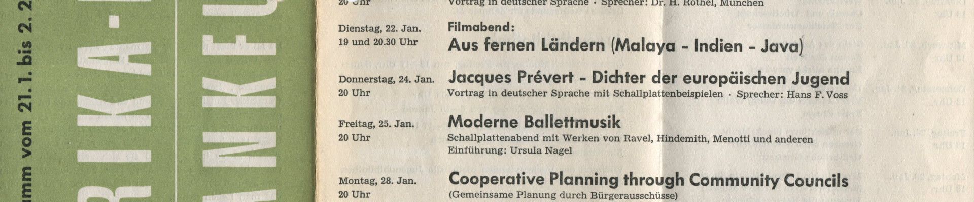 Im Sachgebiet Frankfurter Vereinsarchive liegt unter anderem der Bestand „Amerika Haus Frankfurt“ (V 113). Er wurde 2006 als Schenkung an uns abgegeben und enthält Unterlagen des im Mai 1946 in der Taunusanlage 11 offiziell gegründeten Amerika Hauses.