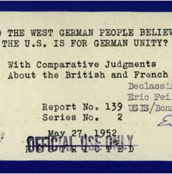 Ein weiteres wichtiges Thema greift der Research Report No. 139 der Serie 2 vom 27.05.1952 auf. Er trägt den Titel: „Do the West German People Believe the US is for German Unity? With Comparative Judgments about the British and French”, beschäftigt sich also mit der Fragestellung, ob die Westdeutsche Bevölkerung glaubt, dass die USA für die Deutsche Einheit ist und detaillierter, inwiefern sie glauben, dass alles hierfür getan wird und was die Gründe dafür und dagegen sein könnten. Die gesamte Studie basiert auf 3 verschiedenen Umfragen, durchgeführt durch „The Reactions Analysis Staff“ des „Office of Public Affairs“, die 800 Befragungen zusammengeführt haben, sowie mehrere Nebenstudien mit 1200 Befragungen und 189 Interviews mit Ostdeutschen, die Westberlin besuchten. In Westdeutschland wurden die Interviews, wie sonst auch üblich, durch die DIVO – Gesellschaft für Markt- und Meinungsforschung mbH in Frankfurt am Main durchgeführt.