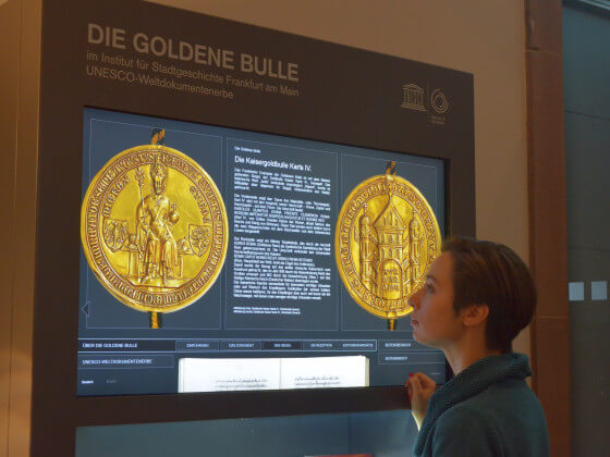 Damit verfügt das Institut für Stadtgeschichte über das aktuell modernste und sicherlich ansprechendste multimediale Angebot zur Goldenen Bulle (weitere Exemplare, die auch zum Weltdokumentenerbe zählen, liegen in Darmstadt, München, Nürnberg, Stuttgart und Wien (Österreichische Nationalbibliothek; Österreichisches Staatsarchiv: Link 1, Link 2). Eine Internetversion der digitalen Präsentation findet sich seit Ende März 2017 hier.