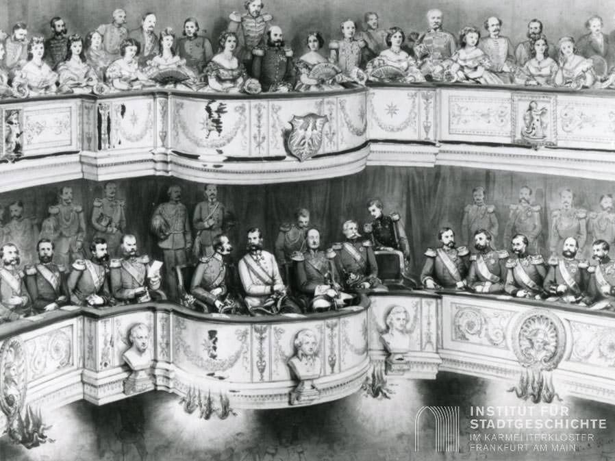 Die Teilnehmer des Frankfurter Fürstentages bei einem Besuch im Komödienhaus 1863