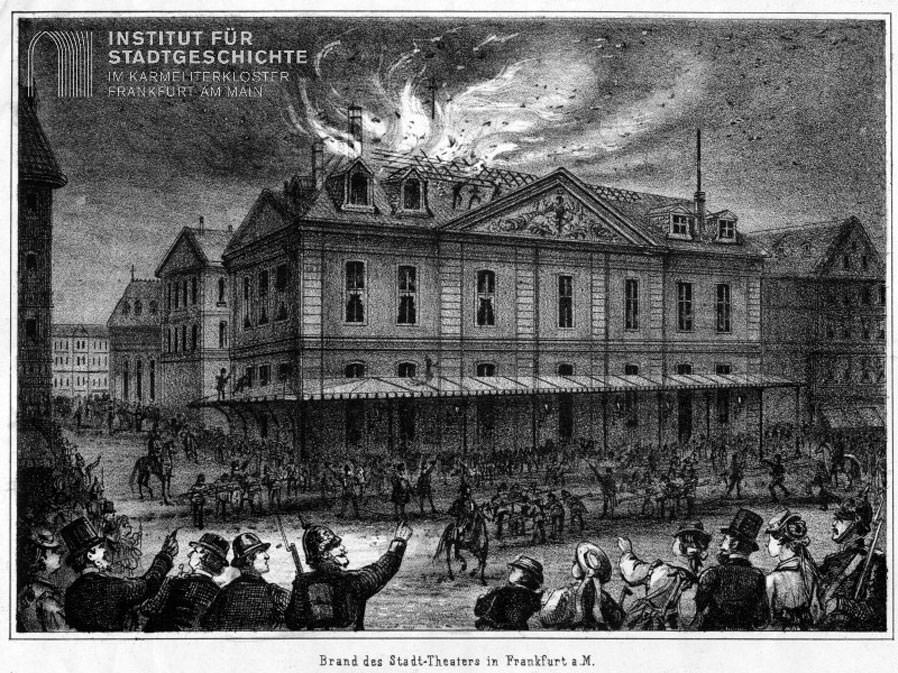 Weniger glanzvoll, aber mindestens genauso beeindruckend muss das neue Schauspielhaus in der Nacht des 16. April 1785 auf die Stadt gewirkt haben, als dort zum ersten Mal ein Feuer ausbrach. Der Brand entstand in den Wohnräumen des Direktors Gustav Friedrich Wilhelm Großmann, der zusammen mit seinen sechs Kindern aus dem Schlaf gerissen wurde und nur knapp mit dem Leben davonkam. Insgesamt ging die Situation allerdings glimpflich aus. Das Theatergebäude erlitt durch die Flammen keinen großen Schaden und schon drei Tage später fand wieder eine Aufführung statt. Bevor diese begann, hielt Großmann vor versammeltem Publikum eine Rede, bei der er in halbverbranntem Frack, mit Verband um Kopf und Hände und mit seinen schluchzenden Kindern an seiner Seite auftrat. Das Feuer hatte große Teile seines persönlichen Besitzes vernichtet. Dabei handelte es sich nur um einen von insgesamt vier Bränden, die das Theater innerhalb der ersten hundert Jahre seines Bestehens verkraften musste. Der mit Abstand zerstörerischste ereignete sich sehr viel später, am 10. Juli 1878. An diesem Tag wäre beinahe das gesamte Gebäude den Flammen zum Opfer gefallen. Doch die Frankfurter Bevölkerung kam mit einem Schrecken davon und das Komödienhaus blieb noch einige Zeit eine ihrer beliebtesten Lokalitäten, bis der ständige Platzmangel die Stadt dazu zwang, sich um einen Ersatz zu bemühen.