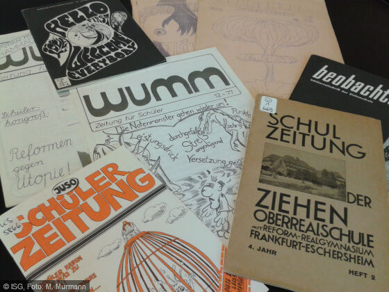Vor allem in den Periodika-Sammlungen der Bibliothek, aber auch in Nachlässen, Dokumentationsmappen und anderen Beständen verteilt finden sich knapp 100 verschiedene Frankfurter Schülerzeitungen. Sie sind mal einfacher, mal grafisch professioneller gestaltet und geschrieben von Schülern für Schüler.