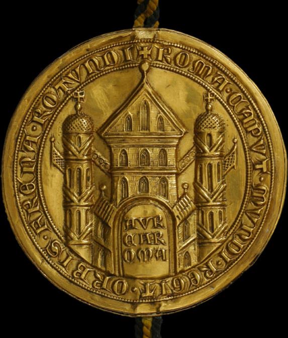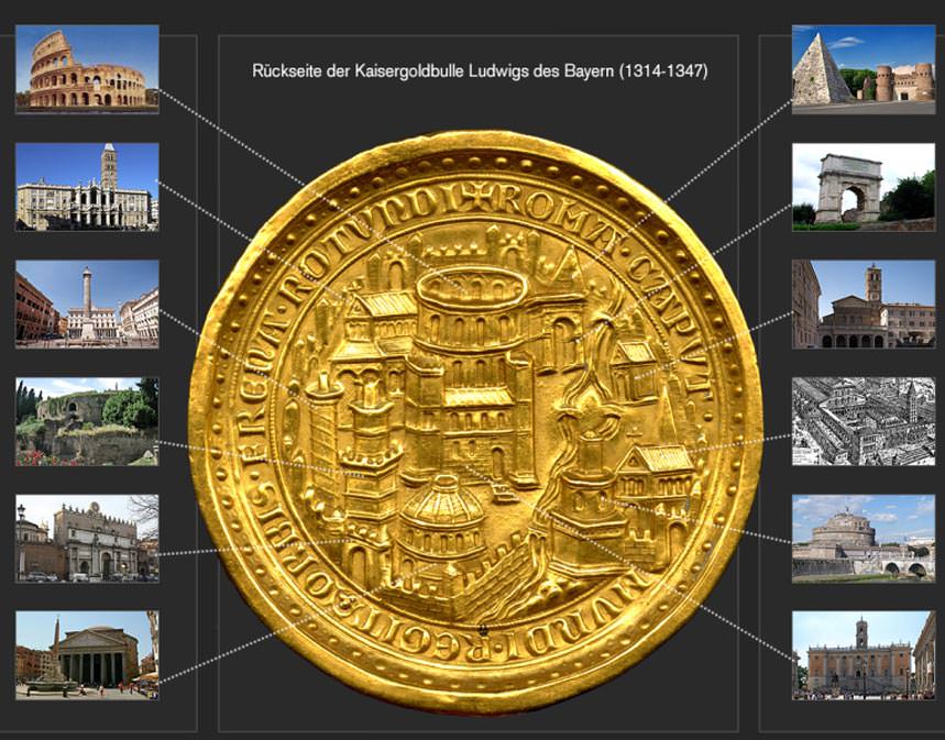 Mittelalterliche Urkunden brachten durch die Gestaltung ihres Schriftbildes, des Schmuckes und des Siegels die Würde des Herrscheramtes zum Ausdruck und dienten so der politischen Kommunikation. Mit dem Rückgriff auf eine seit dem 11. Jahrhundert übliche Romdarstellung distanzierte sich Karl IV. von seinem Vorgänger Ludwig dem Bayern. Dieser hatte mit einer ganz neuen Romdarstellung demonstriert, dass er sich 1328 gegen den Widerstand des Papstes (angeblich) im Namen des Volkes zum Kaiser hatte krönen lassen. Ludwigs Goldbulle zeigt erstmals eine perspektivische Darstellung Roms mit zahlreichen erkennbaren antiken und mittelalterlichen Bauwerken. Im Zentrum steht der Senatorenpalast, Sitz der stadtrömischen Regierung und damit Zeichen der Legitimation von Ludwigs Kaisertum durch Senat und Volk von Rom.