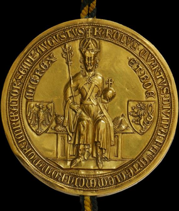Die Goldene Bulle war das wichtigste Verfassungsdokument des Heiligen Römischen Reiches bis zu dessen Ende 1806 zu Zeiten Napoleons. Es legte in lateinischer Sprache das Verfahren der deutschen Königswahl fest und war auf Initiative des römisch-deutschen Kaisers Karl IV. (1346/49-1378) entstanden. Der Name leitet sich von dem goldenen Siegel der Urkunde ab und wurde seit dem 15. Jahrhundert gebräuchlich. Der Erlass der Goldenen Bulle ist ein bedeutender Akt aus einer Zeit der europäischen Geschichte, in der viele verschiedene Kulturen und Völker im Heiligen Römischen Reich zusammengefasst waren. Nachdem es immer wieder zu Streitigkeiten und Kriegen um die Königsthronfolge gekommen war, schuf Kaiser Karl IV. mit der Goldenen Bulle eine reichsrechtliche Regelung für die Wahl eines neuen Königs. Das Verfassungsdokument sollte so das Heilige Römische Reich stabilisieren und künftig Konflikte in diesem großen, heterogenen Staatsgebilde vermeiden.