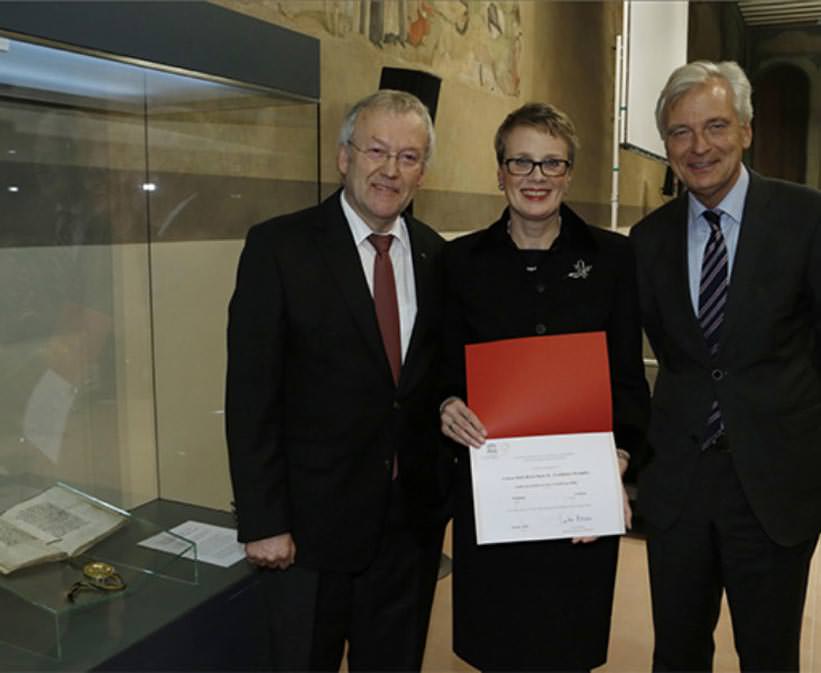 Überreichung der UNESCO-Urkunde am 8. Dezember 2014 im Institut für Stadtgeschichte (von links): Prof. Dr. Joachim-Felix Leonhard, Vorsitzender des deutschen Nationalkomitees für „Memory of the World“, Dr. Evelyn Brockhoff, Leitende Direktorin des Instituts für Stadtgeschichte Frankfurt am Main, und Prof. Dr. Felix Semmelroth, Dezernent für Kultur und Wissenschaft der Stadt Frankfurt am Main