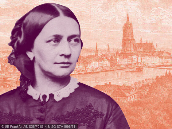 © Montage Clara Schumann, um 1860 © UB Frankfurt/M. S36/F01814 und Mainansicht, um 1890, Zeichnung: W. Klusmeyer © ISG S7A1998/311