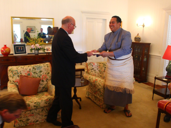 Prof. Dr. Lammert übergibt Kronprinz Tupouto'a Ulukalala ein Faksimile des Geburtseintrags von Karl Gustav Schmitt (Tonga, 9.10.2016)