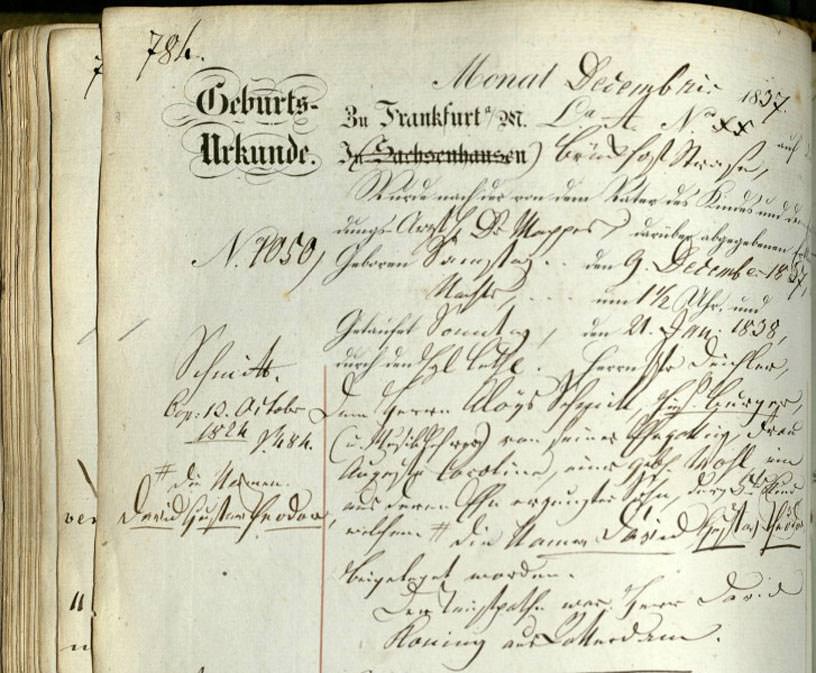Der Sohn Karl Gustav – im Geburtseintrag ursprünglich nur als „David“ Schmitt eingetragen – wurde am 09.12.1837 als fünftes Kind des Ehepaares in Frankfurt geboren. Schon die Wahl des Taufpaten wies über das Territorium der damals Freien Reichsstadt hinaus, denn der Pate war ein niederländischer Kaufmann namens David Koning aus Rotterdam. „Gewisse Gründe von hoher Wichtigkeit“, die leider nicht näher erläutert wurden, brachten Aloys Schmitt dazu, ein Gesuch an den Senat zu richten, um den Vornamen auf „David Gustav Theodor“ zu erweitern, was am 30.08.l838 genehmigt wurde und zur Änderung des Eintrags im Geburtsbuch führte. Er erhielt eine musikalische Ausbildung bei seinem Vater Aloys Schmitt und später an der Frankfurter Musikschule. Mit 19 Jahren soll er Musikdirektor in Würzburg und später in Königsberg gewesen sein. Bereits 1859 wanderte er nach Australien aus. Dort gab er sich als gebürtiger Münchener aus und änderte seinen Namen in Gustav Wilhelm Carl Schmitt. Irgendwann vor 1874 komponierte er die Musik der Nationalhymne für Tonga. In Australien lebte er auch, als seine Mutter am 06.05.1872 – der Vater war schon seit dem 25.07.1866 tot – in Frankfurt verstarb und ihm dorthin eine Abschrift des Testaments geschickt wurde. Zu der Zeit war offensichtlich nur sein Bruder, der Chemiker Ernst Adolf Schmitt, noch in Frankfurt. Seine Schwester Antonie Johanna Caroline verh. Haast, eine Musiklehrerin, war 1859 gestorben und der Bruder Georg Ludwig Aloys Schmitt war Hofkapellmeister in Schwerin. Die Schwester Franziska Josephine war mit dem ungarischen Finanzrat Johann Heinrich Ritter von Floch verheiratet. Sein Schwager Johann Franz Julius Haast war 1859 als Geologe nach Neuseeland gegangen und ließ sich dort nach dem Tod seiner Frau dauerhaft nieder. Seit 1881 lebte Karl Gustav Schmitt endgültig auf Neuseeland, wo er als Komponist und Dirigent von Chören und Orchestern wirkte, die als Amateure auftraten. Am 22.03.1900 starb er in Clevedon und hinterließ eine Frau und zwei Kinder.Kontakt: Volker Harms-Ziegler